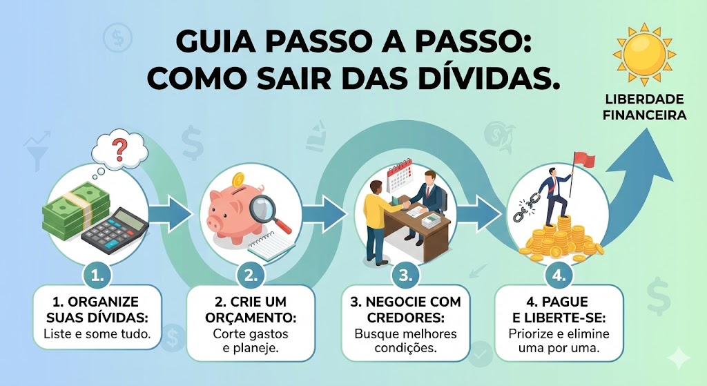 Este guia mostra um passo a passo simples, direto, em português do dia a dia, para sair das dívidas no Brasil. Sem fórmula mágica, sem papo motivacional vazio. É: organizar, negociar, escolher estratégia, cortar o que precisa, aumentar o que dá e seguir o plano. Um dia de cada vez.