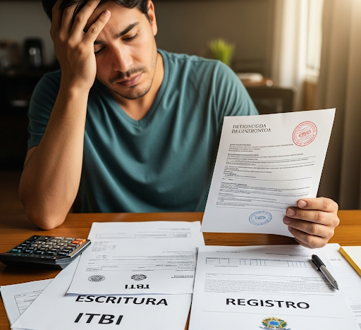 Uma pessoa brasileira frustrada segura documentos imobiliários, com 'ITBI', 'Escritura' e 'Registro' espalhados pela mesa, representando os custos adicionais na compra de um imóvel